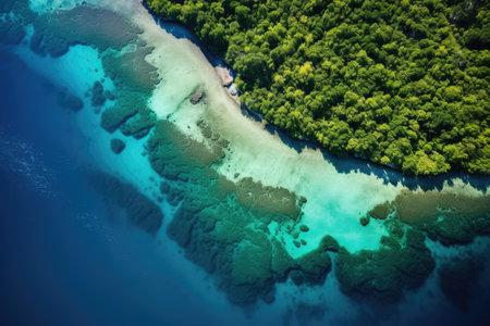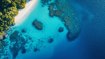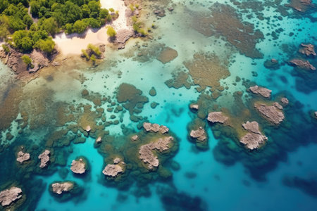 aerial shot of coral reefs near white sandy beaches, created with generative ai