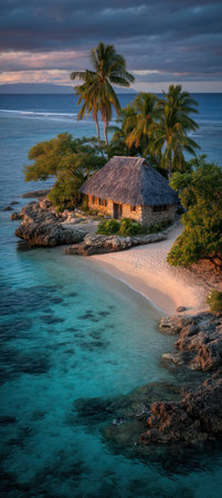 A small cottage sits on a rocky outcrop at the edge of a sandy beach, surrounded by lush green palm trees. The scene is bathed in soft natural light, showcasing the turquoise water and clear skies. This idyllic setting could be used for travel, tourism, or lifestyle content.