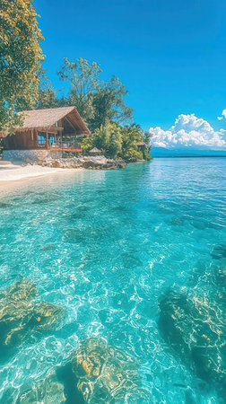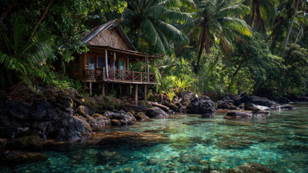 Discover a peaceful island retreat featuring a charming bamboo house surrounded by lush tropical vegetation and crystal-clear water. Perfect for relaxation.