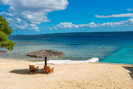 Two deck chairs on a sandy beach in Vanuatu. Copy space for text