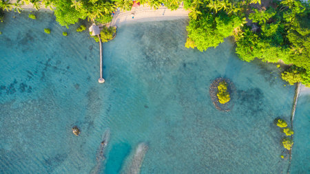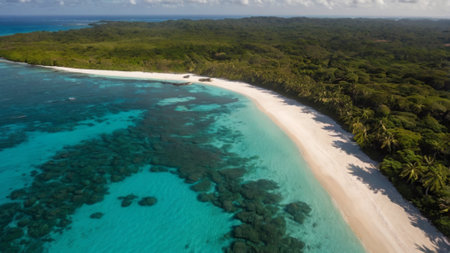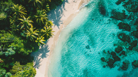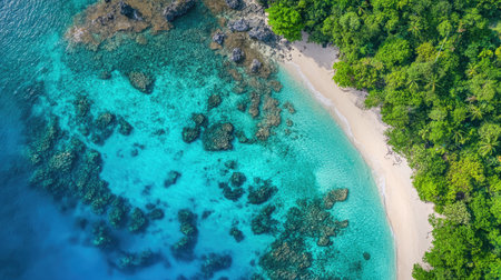 An Aerial view of serene tropical beach with clear turquoise water and lush greenery