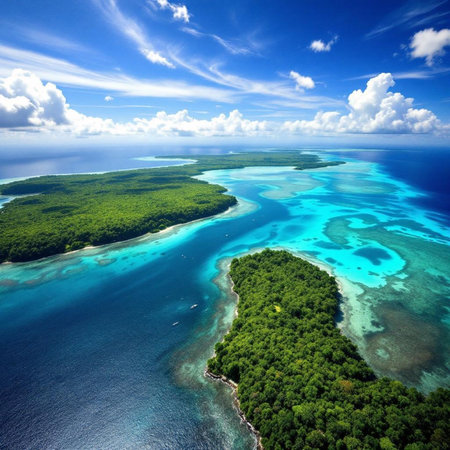 A beautiful island with a blue ocean surrounding it. The island is surrounded by a coral reef and has a lush green forest. The water is calm and clear, and the sky is a bright blue