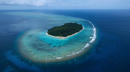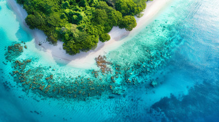 Breathtaking aerial shot of a secluded tropical island surrounded by vibrant blue waters