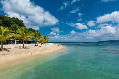 Tropical beach on south side of Samoa Island with coconut palm trees.