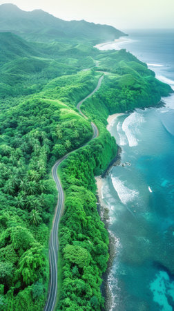 This aerial photo captures a winding road near the ocean, offering a scenic view of the natural landscape and the oceans shoreline.