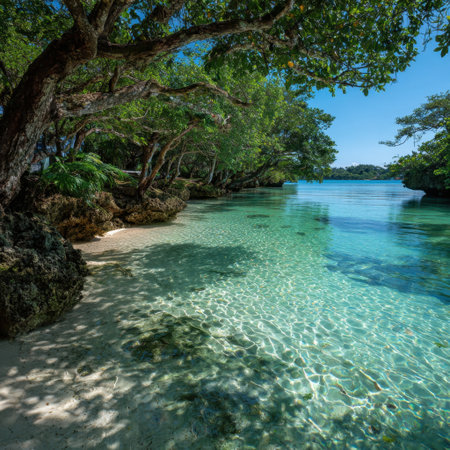 A peaceful beach scene showcasing clear waters and vibrant greenery, perfect for travelers seeking relaxation and natural beauty in a tropical environment.
