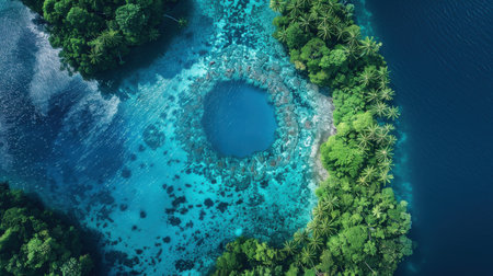 A blue ocean with a large hole in the middle. The hole is surrounded by trees and the water is clear
