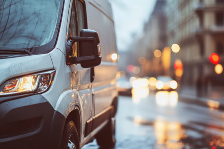 White delivery van parked on a city street, for transportation, logistics, or delivery concepts.