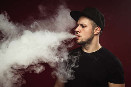 A young European man smokes a vape. Portrait of a white man in a black cap