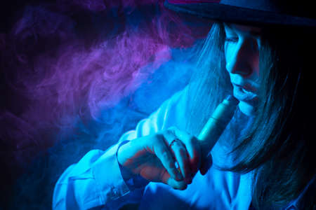 Vape pen in hands woman. Portrait of a girl in clouds of cigarette smoke Young woman smokes electronic cigarette. Vaper is holding a vape pen. Student with a vaping gadget. Vaper girl in neon light