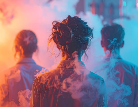Three individuals are seen from the back, enveloped in a vibrant, smoky atmosphere with strong neon lighting in shades of orange and blue, creating a mysterious and atmospheric scene.