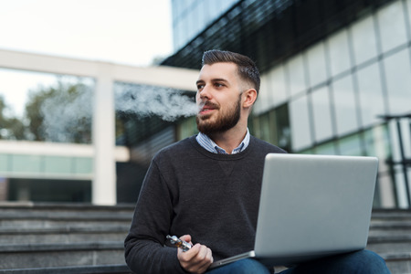 Man with beard smoke electronic cigarette outdoor