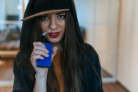 mysterious young girl sits and smokes electronic cigarette