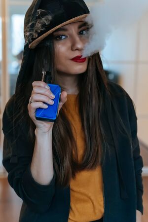 Vaping girl. Young hipster woman vape e-cig at the vapeshop. Hip-hop style. Closeup.