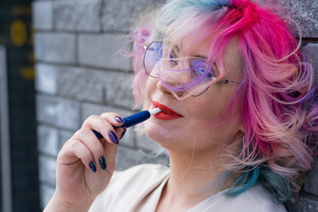Caucasian woman with colored hair smokes an electronic cigarette