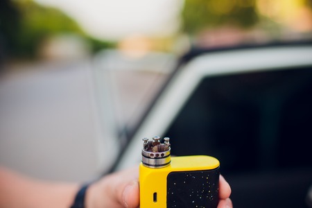 vape, electronic cigarette. blurred background. Popular smoking gadget to people who want to quit smoking nicotine cigarettes and start vaping safe glycerin vape.Trendy electronic cigarette or ecig.