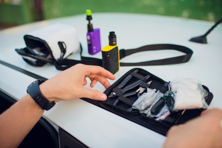 male master installs a coil. Spiral for electronic evaporator and cigarette. Vape, vaping. Firing a coil.