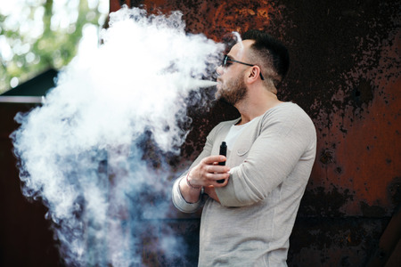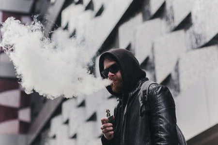 Vaping man holding a mod. A cloud of vapor. Stylish bearded guy with vape.