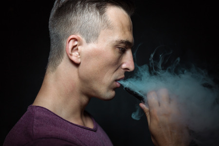 vaping man holding a mod cloud of vapor Black background isolated Selective focus