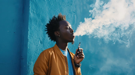 Stylish black young man smoking a cigarette against a bright blue wall with a cloud of steam