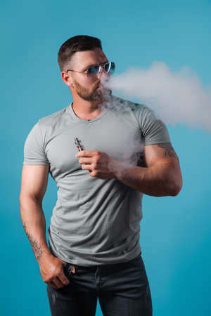 Bearded brutal male in sunglasses smoking a vapor cigarette as an alternative to tobacco. Studio shot on blue background.