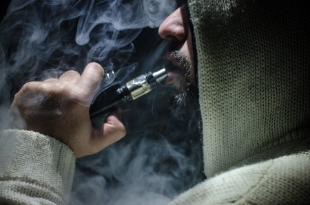 The man smoke an electronic cigarette on the dark background, Men in hoody vaping and releases a cloud of vapor. Guy with vaping on black background