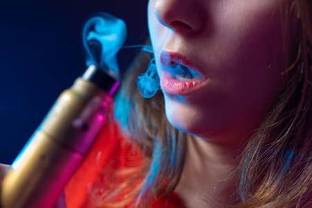 Girl model smokes vape in red light.