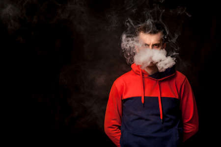 A young dark-haired man with sad eyes in a colored orange and blue hoody standing with arms behind smokes a vape and exhales a white smoke on a black isolated background