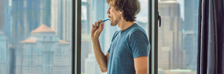 Young man brushing his teeth in his bathroom. BANNER, long format