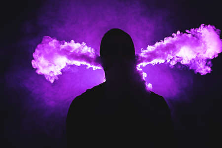 Vaping man. A cloud of vapor. dark blue background.