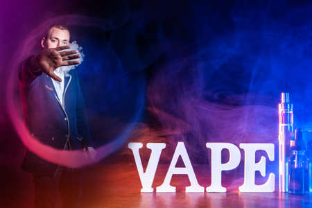 Man in clouds of smoke for vape. Vape logo next to a young man. Guy makes figures out of smoke. Concept - sale of electronic cigarettes. White letters vape stand on the table. E-cig device.
