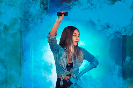 Neon sign VAPE and a young girl with an electronic cigarette. A long-haired girl smokes a VAPE. A woman with a VAPE on a neon background. Smoking electronic cigarettes.