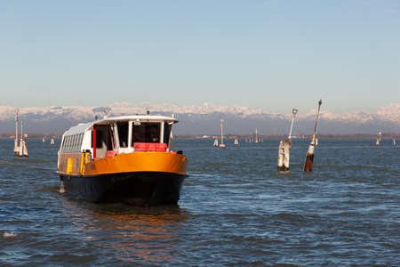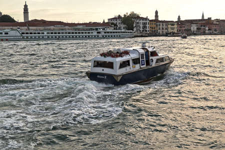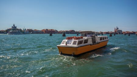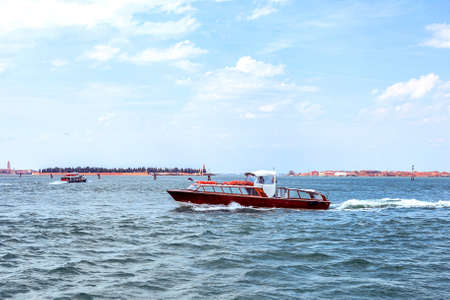 Venice, Italy - August 21, 2015: Boat Airone II transports people in Venetian Lagoon in morning