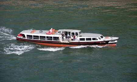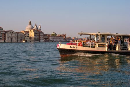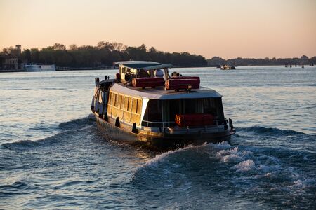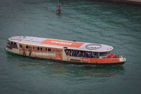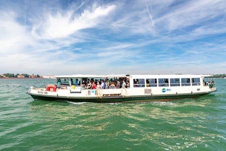 Venice, Italy - 07 May 2018: Vaporetto in the water area of the Venetian lagoon close-up. Tourists see the sights