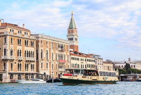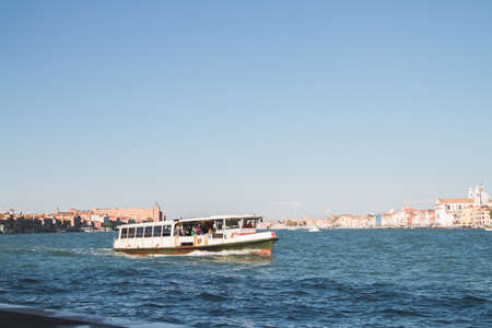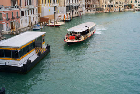 View of the typical vaporetto boat in the Grand Canal in Venice. The vaporetto is a Venetian public waterbus