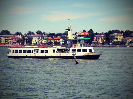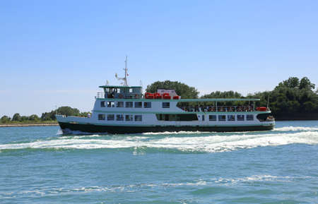 big Passenger ship for the transport of tourists called Vaporetto in the Venetian lagoon in summer