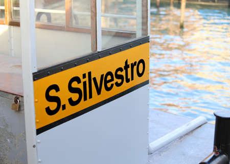 Stop of the boat called vaporetto in a canal of Venice with text S.Silvestro that mean Saint Sylvester