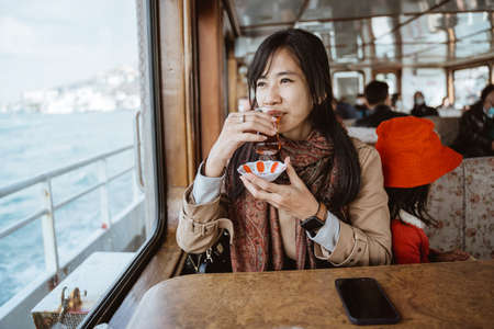 woman sitting on a ferry boat having turkish tea while cruising the bosphorus