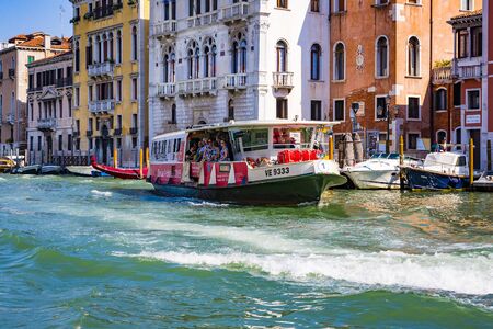Venice, Italy - May 21, 2022: Vaporetto water bus navigating through Grand Canal in Venice, capital of Veneto region and a famous travel destination.