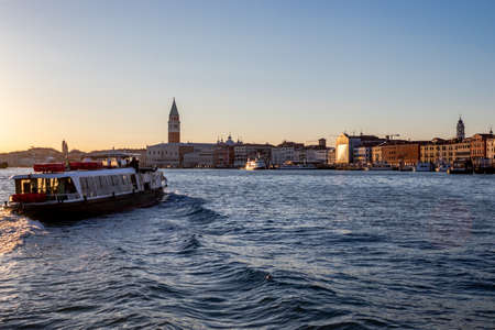 Venice, Italy - July 5, 2021: the ferry on the way to Venice with view to St. Mark's square.