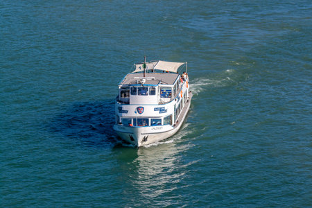 LINDAU, BAVARIA, GERMANY - AUGUST 31, 2025: Passenger ferry boat 'Uhldingen' with tourists on board cruising on the blue water of Lake Constance (Bodensee) near the harbor of Lindau, Germany, on a sunny day