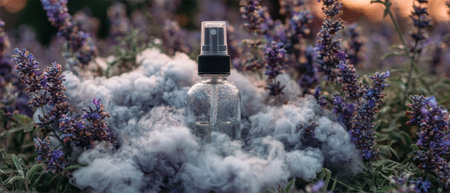 Transparent spray bottle with black cap emerging from smoke and lavender flowers in a field at sunset, creating a dreamy and aromatic atmosphere. Generative ai
