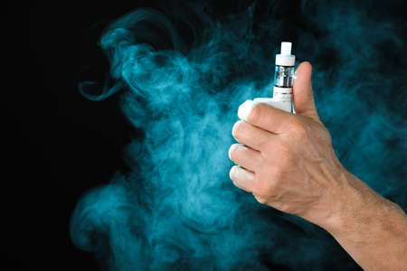 Vaping device in the man's hand. Electronic cigarette and vape concept. Quit smoking.