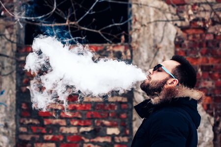 Man with beard smoke electronic cigarette outdoor