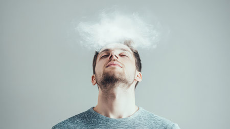 A young man stands with his eyes closed reflecting deeply as a cloud forms above his head symbolizing thoughts and ideas.