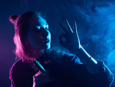 The girl smokes VAPE. A woman with a VAPE makes an OK sign with her hand. Vaper girl on a dark background. A woman lets out smoke from an electronic cigarette. Smoking electronic cigarettes.
