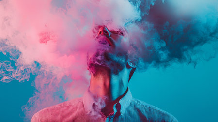 A surreal portrait of a man with colorful pink and blue smoke surrounding him, creating a striking and artistic visual effect.