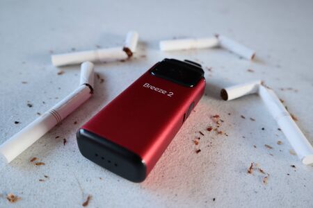 Vape device electronic cigarette aspire breeze, as smoking alternative with broken marlboro gold cigarettes and scattered tobacco on white textured background