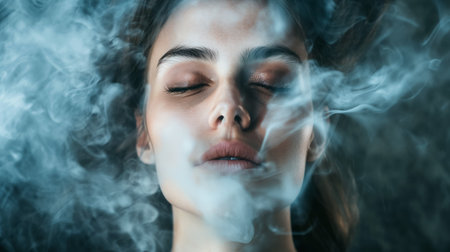 A woman's face is shrouded in mystery as she exhales swirls of smoke, her eyes closed in a moment of tranquil abstraction against a dark backdrop.