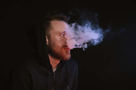 Concept. Smoke enveloped the head man. Portrait of a Bearded, stylish man with smoke. Secondhand smoke.